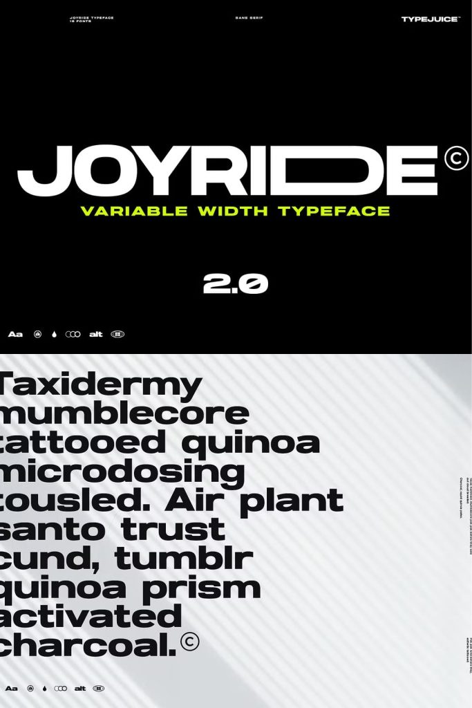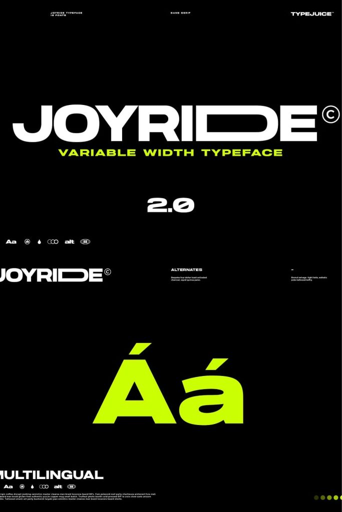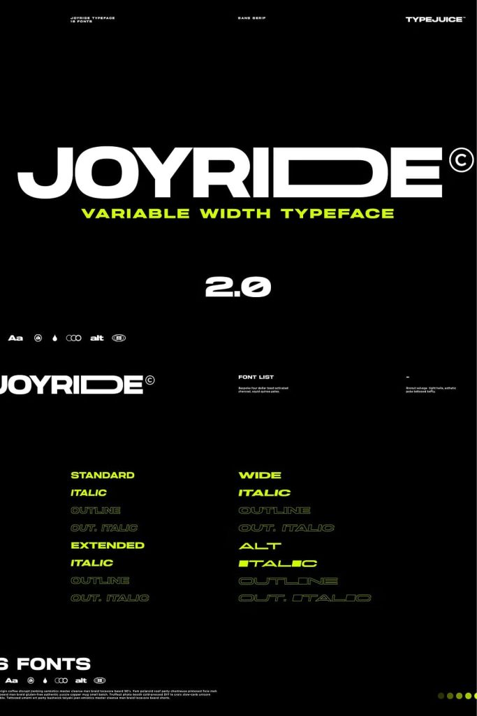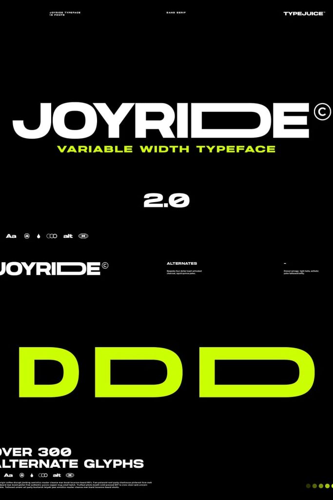 Joyride combines traditional typographic principles with modern innovation. It respects the fundamentals of readability while introducing new possibilities for creative expression. Designers can rely on it to deliver both performance and originality.