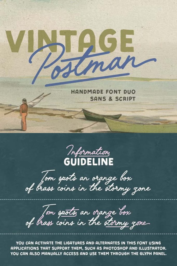 Vintage Postman handmade font duo offers a perfect blend of bold sans serif strength and monoline script elegance. Its handcrafted style, combined with features like alternates, ligatures, and decorative lines, provides designers with the tools to create compelling retro and vintage designs. Whether used for posters, logotypes, quotes, or branding, Vintage Postman delivers a distinctive and timeless typographic experience.